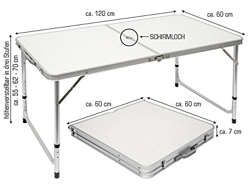 Unser Festival-Star – lässt sich leicht aufbauen und sieht noch dazu sehr gut aus! Der schlichte, schöne, kompakte Camping-Tisch von AMANKA im edlen Grau ist dank kleinem Pack-Maß und geringem Gewicht ideal zum Mitnehmen und Aufbewahren. Der klappbare Alu-Tisch ist ideal nicht nur zum Camping, sondern auch als Gartentisch, für Balkon oder Terrasse. Das nächste Festival, die Kinder Party, Grillen, Angeln, Flohmarkt – irgendwas steht immer an. Oder einfach nur als Beistelltisch für Heimwerker. Der Falt-Tisch steht stabil, die Tischplatte hält auch mal schwere Sachen aus (max. 50 kg) und die Tischoberfläche ist pflegeleicht und einfach zu reinigen. Der Klapptisch wird mit 55/62 cm Höhe zum Spieltisch für Kinder oder mit 70 cm zum Esstisch für Erwachsene. Sonnenschirme bis 2,9 cm Stabdurchmesser können in der Mitte der Tischplatte eingeschoben werden. Der Campingtisch ist im Handumdrehen auf- und abgebaut, er ist für drinnen und draußen geeignet. Ausgeklappt ist der Balkontisch aus Aluminium stabil und groß genug, um mit 6 Personen daran zu essen (ca. 120x60cm). Die faltbare Tischplatte hält auch mal bis zu 50kg aus. Zusammengeklappt ist der Tisch als Klappkoffer tragbar, so wiegt er nur 4,9 kg. Robust und stabil und mit dem eingebauten Tragegriff besonders leicht zu transportieren – zusammengeklappt findet der verstellbare Terrassentisch aus Metall garantiert noch einen Platz im kleinsten Wohnwagen. Produktdaten: – Maße Tisch aufgebaut (LxBxH): ca. 120 x 60 x 55-62-70 cm – Maße Tisch zusammengeklappt LxBxH: 60 x 60 x 6 cm – Material (Tisch): Aluminium / MDF-Tischplatte – Gesamtgewicht: ca. 4,9 kg – Tisch-Belastbarkeit max. 50 kg
