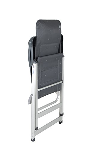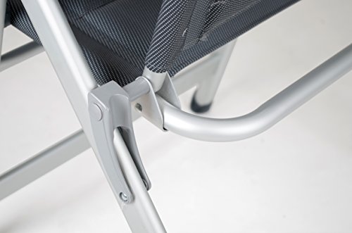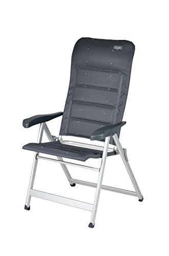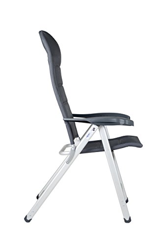 Der Premium-Sessel mit hoher Rückenlehne und weich gepolstertem Bezug (60 % Polyvinylchlorid, 40 % Polyester) sorgt für optimalen Sitzkomfort, ist wetterfest und wasserdurchlässig bzw. schnelltrocknend.Lieferung inkl. Hängetasche.Art Sitzmöbel: KlappstuhlBelastbar bis: 140 kgBreite Sitz-/Rückenlehne: 50 cmHöhe Rückenlehne: 82 cmIntegriertes Polster: JaMaterial Bezug: 60 % Polyvinylchlorid, 40 % PolyesterSitzhöhe: 45 cmMaße offen (BxHxT): 67 x 117 x 70 cmPackmaß (LxBxH): 114 x 67 x 8 cmSitzfläche (BxT): 50 x 40 cmMaterial Gestell: 100 % AluminiumRohrdetails: Ovalrohr 40 x 20 mmRückenlehne: 7-fach verstellbarFarbe: dunkelgrauGewicht: 5 kg