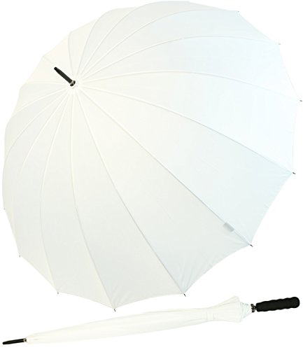 iX-brella golf 16-teilig – leichter, schöner und großer XXL Partnerschirm Fallen Sie auf mit diesem wunderschönen großen Regenschirm. Das aus 16 Teilen bestehende Dach ist ein echter Hingucker. Das besonders leichte, aber mit 1,29 Meter Durchmesser extra große und stabile Schirmdach schützt Sie, Ihr Gepäck, oder eine zweite Person zuverlässig, auch bei stärkerem Regen. Der große Golfschirm hat ein leichtes, stabiles und flexibles Fiberglas-Gestell. Mit nur etwas mehr als 490 Gramm wird dieser Regenschirm nicht zu Last, wenn man ihn etwas länger tragen muss. Der weiche, sich warm anfühlende Softgriff ist ein echter Handschmeichler, den Sie an kalten Tagen zu schätzen lernen.Im Gegensatz zu den meisten Billigschirmen, ist der Bezug hier nicht aus billigen, knittrigen Nylon-Stoff, sondern aus hochwertigen, weichen und farbintensiven Pongee-Polyester. Ein Unterschied, den man sofort sieht.Merkmale:· Gestell: Fiberglas 16-teilig – Handöffner· Typ: Partnerschirm· Durchmesser ca. 129 cm· Größe geschlossen ca. 100 cm· Dachunterteilung: 16 Segmente· Bezug: 100 Prozent Pongee-Polyester· Gewicht ca. 490 g