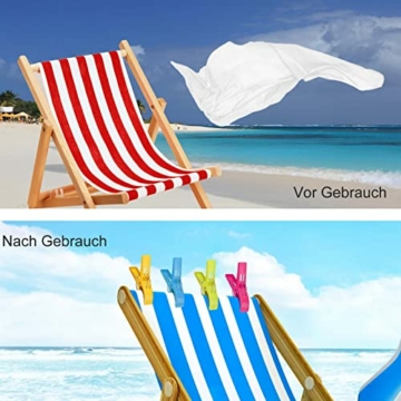 - [Praktikabilität] Hochfeste Federclip ist ideal zum Befestigen von Strandtüchern und Kleidung am Liegestuhl, wenn Sie sich in der Sonne befinden, und verhindert, dass Ihre Sachen von starkem Wind weggeblasen werden. Sie sind besonders nützlich im windigen Frühjahr und Herbst und können eine große Hilfe bei Ihrem Strandurlaub sein.