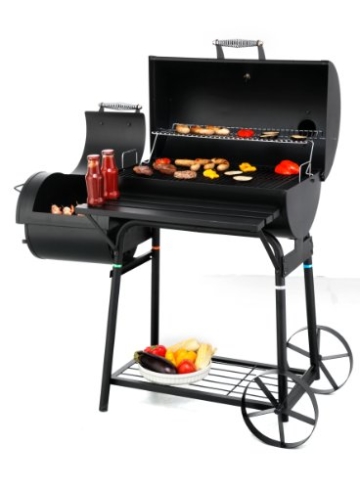 Holzkohlesmoker mit zwei Brennkammern für ein optimales Grillvergnügen, Auch „Räuchern“ und „Indirekt Grillen“ ist mit dem Smoker im Western-Style möglich, Fahrbar durch große Stahlräder, Hitzefeste Lackierung (bis 350°), Eine gesunde Art zu Grillen – denn weder Fett noch Flüssigkeiten…