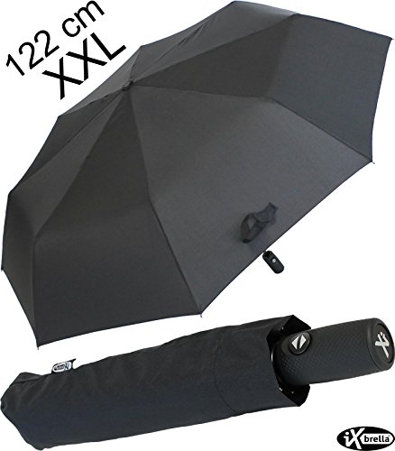 iX-brella full class XXL – Taschenschirm für Damen und Herren mit 122 cm großem DachEin Schirm, unter dem man auch bei richtig starkem Regen trocken bleibt. Auch zwei Personen schützt das große Dach dieses Partnerschirms zuverlässig. Dieser Regenschirm sollte in keinem Auto fehlen. Sein Sie sich sicher, wenn es einmal richtig regnet, freuen Sie sich, wenn Sie zum „full class XXL“ greifen können.Geöffnet und geschlossen wird das riesige Dach per Knopfdruck. Um den Federmechanismus der Auf- und Zu- Automatik neu zu spannen, muss lediglich der Teleskopstock wieder zusammen geschoben werden, was auf Grund der Größe des Schirms, etwas Kraft kostet. Der angenehm große Knauf-Griff ist ergonomisch so gestaltet, dass der Schirm sehr gut in der Hand liegt, wodurch sich der Schirm auch lange Zeit angenehm tragen lässt.Dieser Taschenschirm in Doorman-Größe, ist der optimale Begleiter bei wirklich starkem Regen, im Auto, oder im Reisegepäck.Merkmale: · Stabiles Stahl-Gestell mit Fiberglaskomponenten· Mechanismus: Auf-Zu-Automatik· Großer ergonomischer Griff· Durchmesser ca. 122cm· Größe Zusammengelegt ca. 34,5cm· Dachunterteilung: 8 Segmente· Bezug: 100 Prozent Polyester· Gewicht ca. 520g